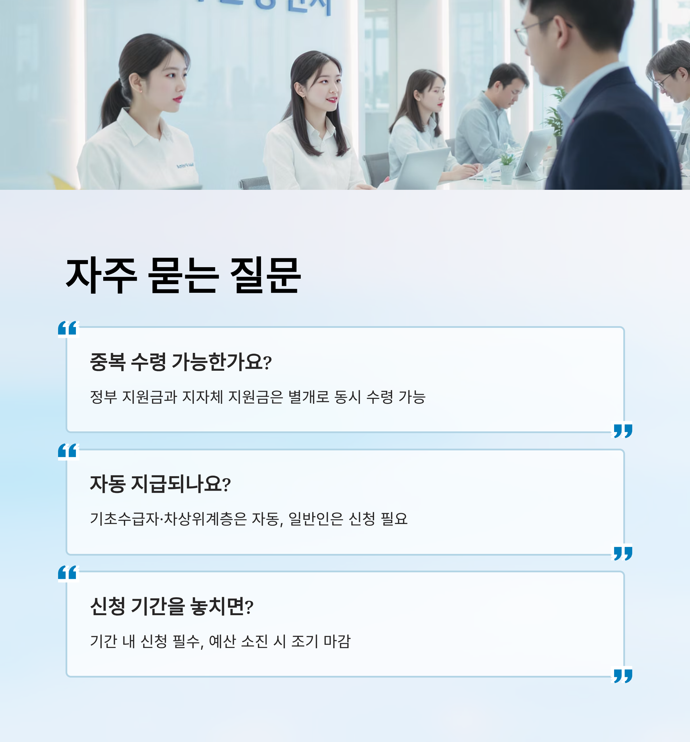 많은 분들이 헷갈리는 부분은 정부 지원과 지자체 지원이 동시에 가능한지예요. 결론부터 말하면 중복 수혜는 일부 가능해요. 중앙정부에서 주는 지원금과 지자체에서 추가로 주는 지원금은 별개이기 때문에, 두 가지 모두 받을 수 있답니다. 다만 같은 지자체 내에서 동일 가구원이 중복 신청하는 것은 불가능해요.
