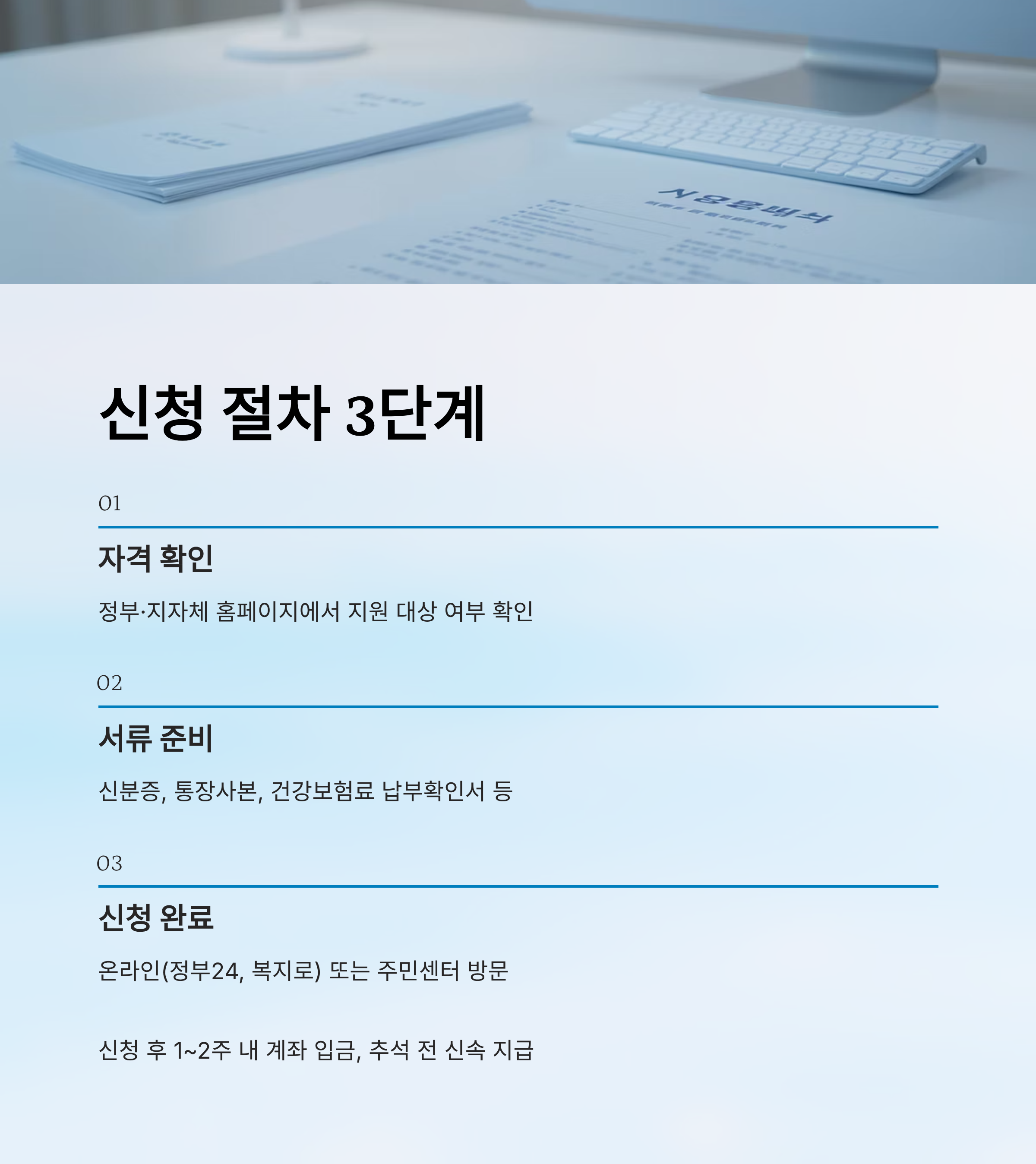 ③ 신청 및 지급받기 – 준비가 끝나면 신청을 진행해요. 정부 지원은 정부24, 복지로, 보조금24 같은 온라인 포털에서 가능하고, 주민센터에서도 직접 신청할 수 있어요. 신청 후에는 1~2주 내에 지급되는데, 추석 전에 받을 수 있도록 신속하게 처리되는 경우가 많아요. 지자체별 지원금도 비슷한 방식으로 지급돼요.