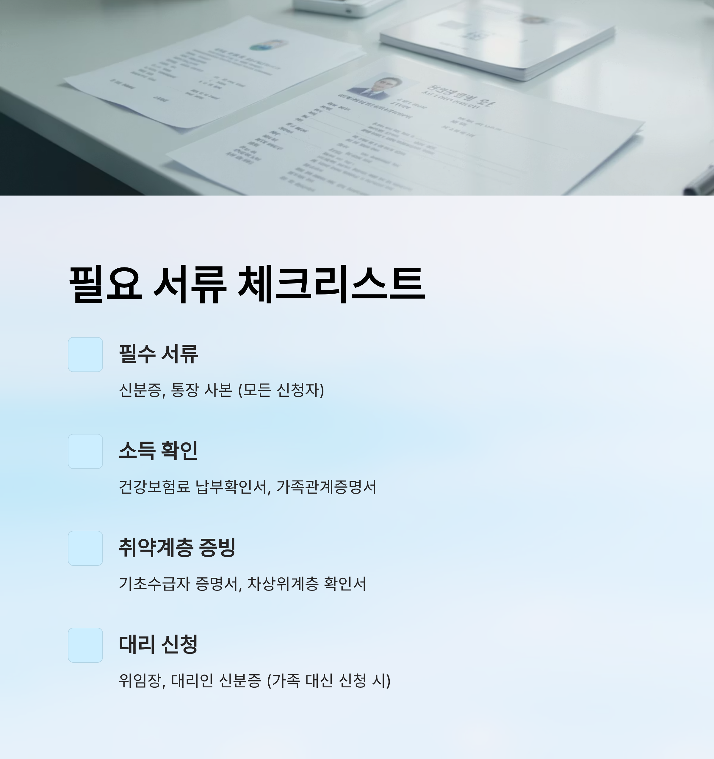 ⑥ 취약계층 관련 증빙 – 기초생활수급자 증명서, 차상위계층 확인서, 장애인등록증 등은 해당 계층임을 증명하는 서류예요. 자동 지급 대상자는 별도의 제출이 필요 없지만, 지자체 신청 시에는 요청받을 수 있어요.