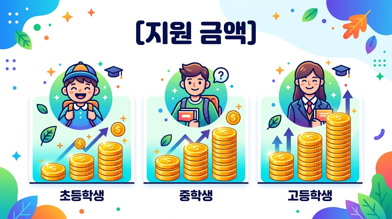 가장 궁금해하실 포인트죠! 2026년 지원금은 학급별로 차등 지급됩니다. 초등학생은 20만 원, 중학생은 30만 원, 고등학생은 50만 원 내외로 책정되었습니다. 작년에 비해 고등학생 지원금이 조금 더 상향되었는데, 아무래도 수험생이나 입시 준비로 비용이 많이 들어가는 현실을 반영한 것 같습니다.