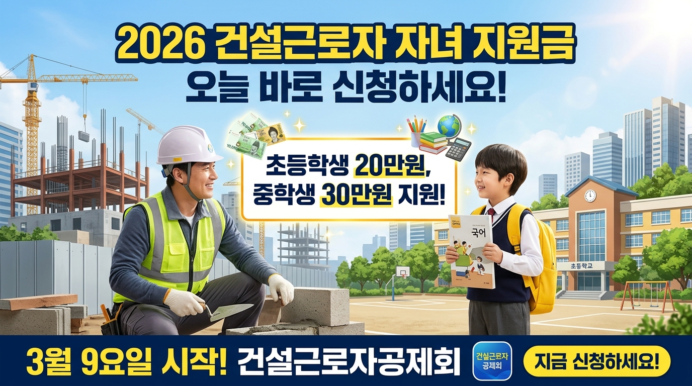 안녕하세요! 건설 현장에서 땀 흘리며 우리 가족의 미래를 일궈가시는 모든 근로자 여러분, 정말 고생 많으십니다. 😊 사실 요즘 아이들 키우다 보면 교육비가 만만치 않잖아요? 초등학교 입학할 때부터 고등학교 졸업할 때까지 들어가는 비용이 한두 푼이 아니죠. 특히 새 학기가 시작되는 3월은 부모님들의 어깨가 더 무거워지는 시기이기도 합니다. 그래서 오늘 제가 들고 온 소식은 바로 '2026년 건설근로자 초·중·고교생 자녀 지원금' 신청 소식입니다! 바로 오늘부터 접수가 시작되었거든요. 이 글을 끝까지 읽으시면 누가 받을 수 있는지, 서류는 무엇인지 완벽하게 파악하실 수 있을 거예요. 자, 그럼 차근차근 알아볼까요? ✨