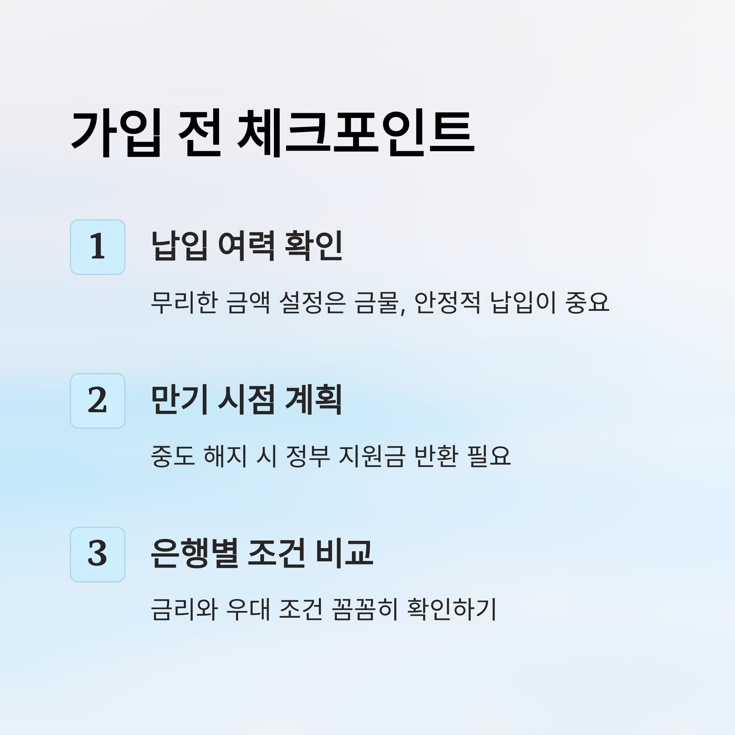 정리하면, 본인 소득 기준, 납입 여력, 만기 시점, 은행별 조건, 세금 혜택 등을 꼼꼼히 따져봐야 해요. 그래야 중도 해지 없이 끝까지 유지할 수 있고, 혜택도 최대한 누릴 수 있어요. 💡