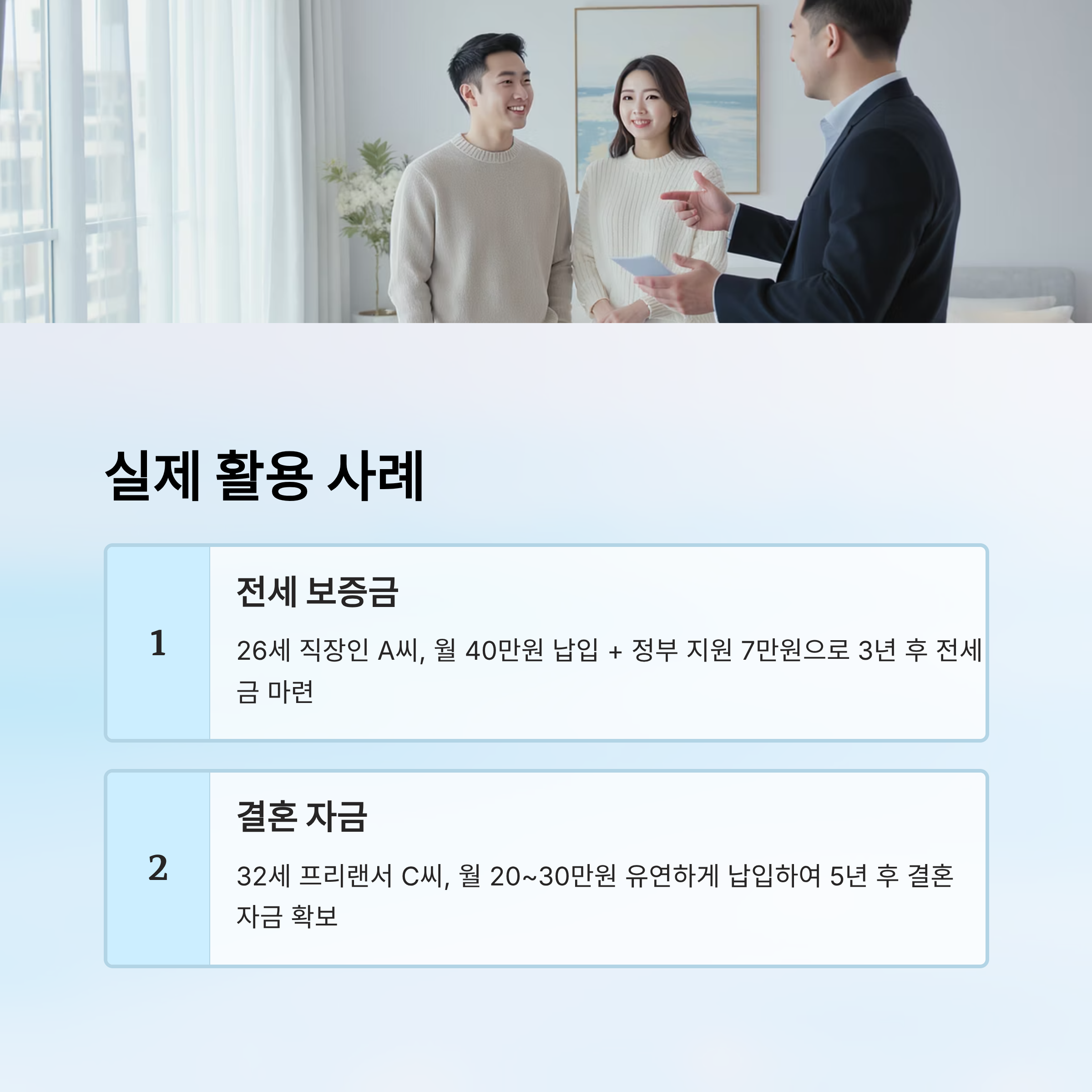 청년미래적금과 청년도약계좌가 실제로 어떻게 쓰일 수 있는지 사례를 통해 살펴보면 훨씬 이해가 쉬워요. 예를 들어 대학을 갓 졸업하고 첫 직장을 다니는 26세 청년 A씨는 월급에서 40만 원을 떼어 청년미래적금에 넣었어요. 정부가 소득 수준에 따라 매월 7만 원을 추가 지원해 줬고, 비과세 혜택까지 적용되면서 3년 만기 시점에 예상보다 훨씬 많은 금액을 손에 쥘 수 있었답니다. 이 돈은 전세 보증금 일부로 활용했어요.