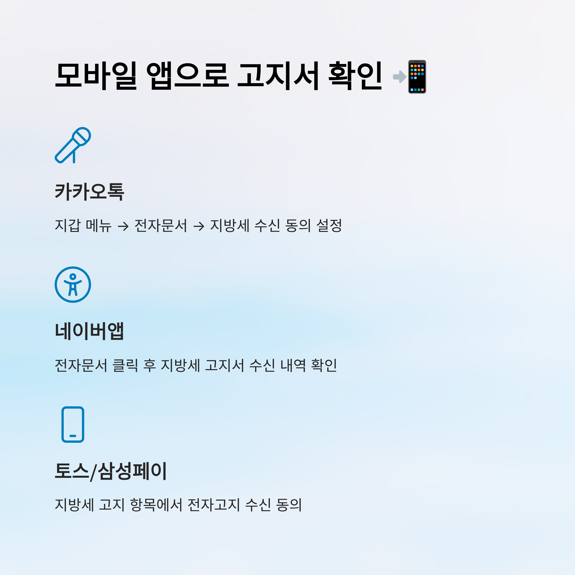 고지서를 스마트폰으로도 쉽게 확인할 수 있어요! 특히 ‘카카오톡 지방세 고지’, ‘네이버 전자문서’, ‘토스’, ‘삼성페이’ 앱에서도 재산세 고지서를 받을 수 있도록 설정할 수 있답니다. 이건 고지서가 안 보일 때도 다시 확인 가능하니까 정말 유용해요. 📩