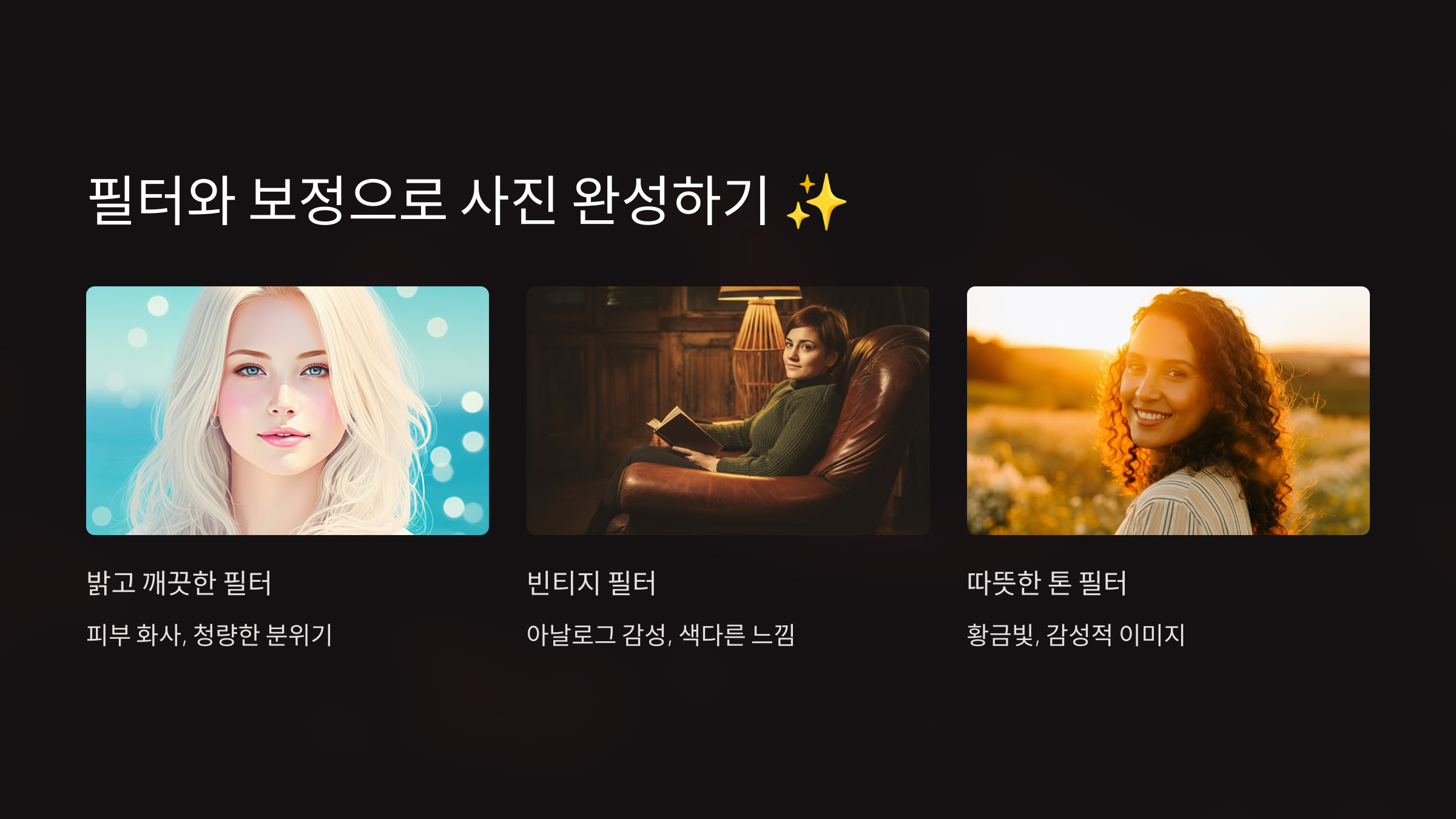 - 따뜻한 톤 필터: 황금빛과 같은 따뜻한 느낌을 강조해 감성적인 이미지를 만듭니다.
