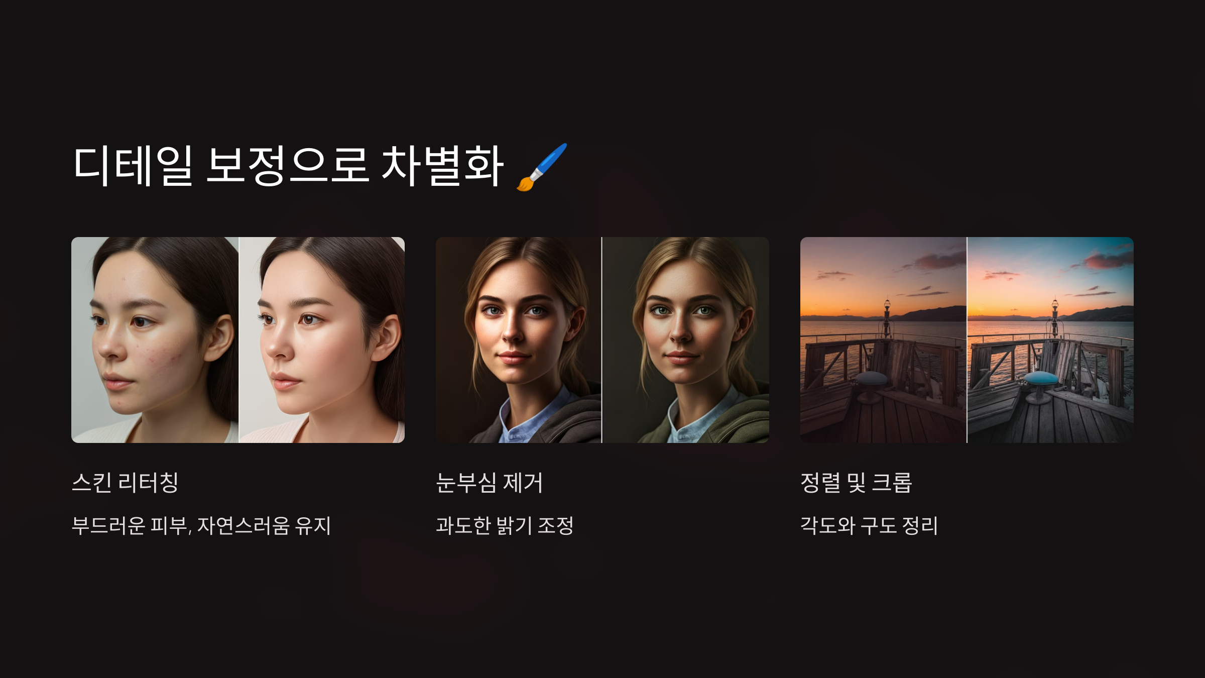 - 정렬 및 크롭: 사진의 각도와 구도를 정리하여 안정감을 줍니다.