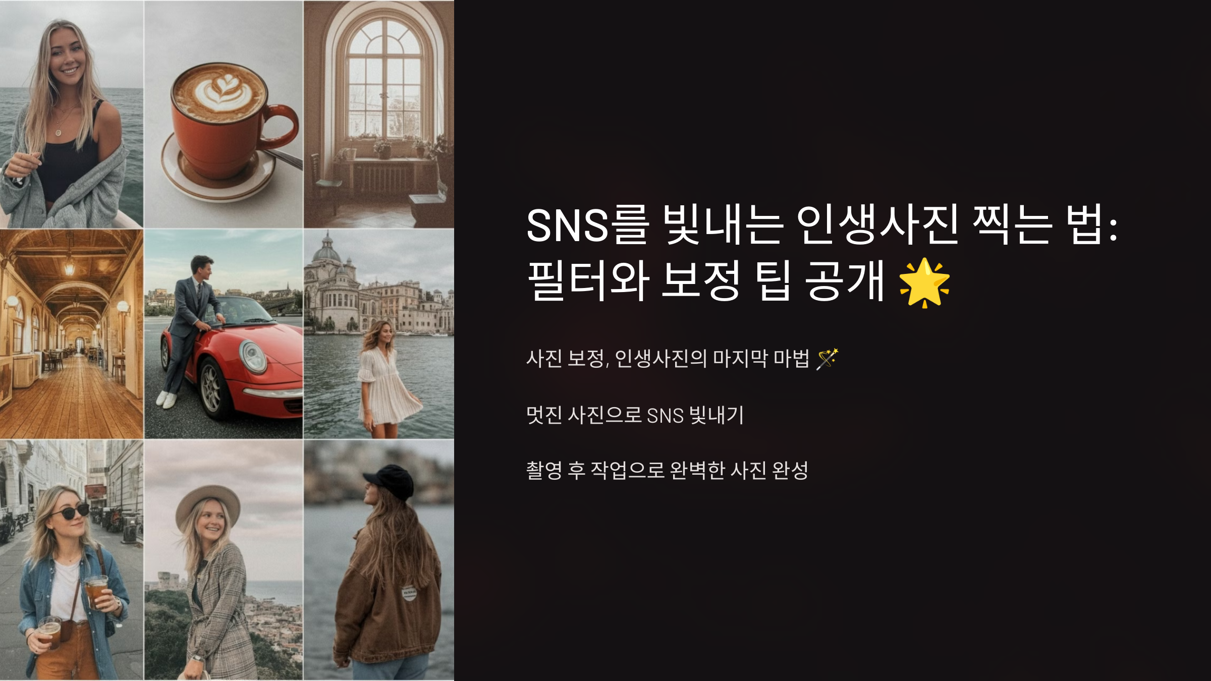 인생사진은 촬영으로 끝나지 않습니다. 필터와 보정을 통해 사진의 매력을 극대화할 수 있죠. 오늘 소개한 팁을 활용하면 여러분의 SNS가 더 반짝일 거예요! 🌟 이제 직접 보정하면서 나만의 스타일을 찾아보세요. 인생사진의 주인공은 바로 여러분입니다. 😊